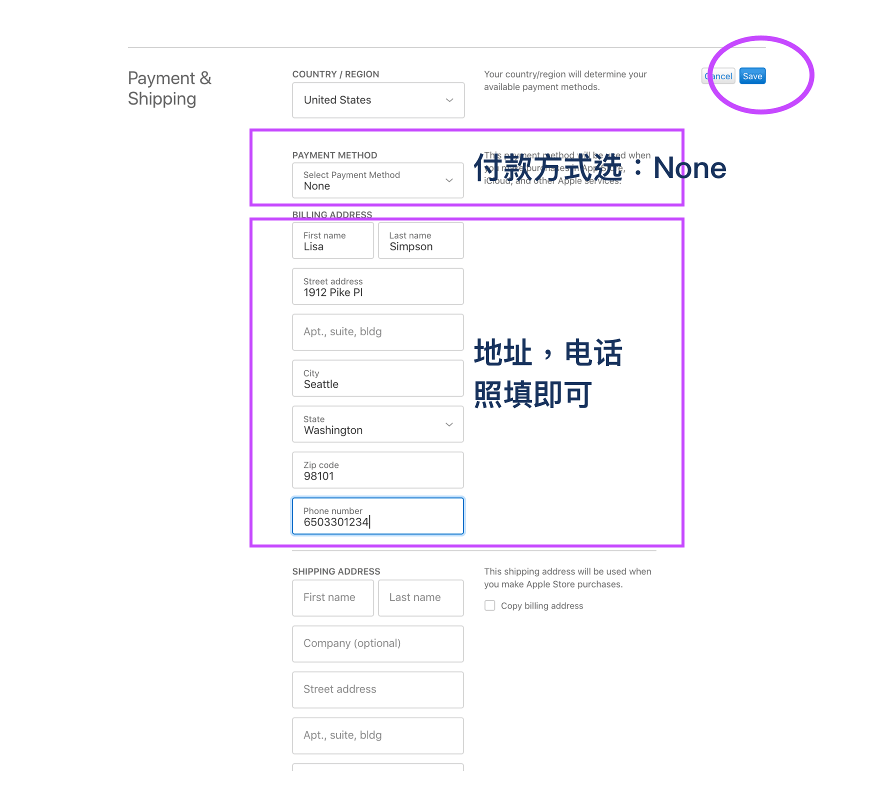 地址、电话照填即可。注意:付款方式选择“None”。